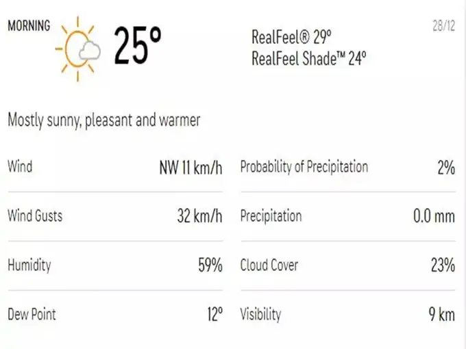 सेंच्युरियन: दक्षिण आफ्रिकेविरुद्ध सुरू असलेल्या बॉक्सिंग डे कसोटीचा दुसरा दिवस पावसामुळे वाया गेल्याने भारतीय चाहते निराश झाले असतील. टॉस जिंकून पहिल्या दिवशी चांगली सुरूवात केल्यानंतर आता टीम इंडिया मोठी धावसंख्या करण्याचा प्रयत्न करेल, त्याच बरोबर पुन्हा फलंदाजी करण्याची वेळ येऊ नये अशी रणनिती आखेल. वाचा- रुग्णालयात पहिल्या दिवशी भारताने ३ बाद २७२ धावा केल्या होत्या, यात केएल राहुलच्या नाबाद १२२ आणि अजिंक्य रहाणेच्या नाबाद ४० धावांचा समावेश आहे. या दोघांनी चौथ्या विकेटसाठी ७३ धावांची भागिदारी केली आहे. वाचा- असे असेल तिसऱ्या दिवसाचे हवामान सेंच्युरियनच्या सुपरस्पोर्ट्स मैदानावर सोमवारी टप्प्या टप्प्याने पाऊस पडत होता त्यामुळे मैदान सूखले नाही. आज मंगळवारी देखील ढगाळ हवामान असेल असा अंदाज व्यक्त करण्यात आला आहे. एक्यू वेदर डॉट.कॉमने दिलेल्या अंदाजानुसार तापमान २७ डिग्री सेल्सियस असेल. हवा थंड असेल आणि वारे देखील असेल. अधून मधून उन देखील येण्याची शक्यता आहे. पण दुपारपर्यंत ढगाळ वातावरण असे. दिवसभरात पावसाची शक्यता नसल्याचा या अंदाजात म्हटले आहे. वाचा-